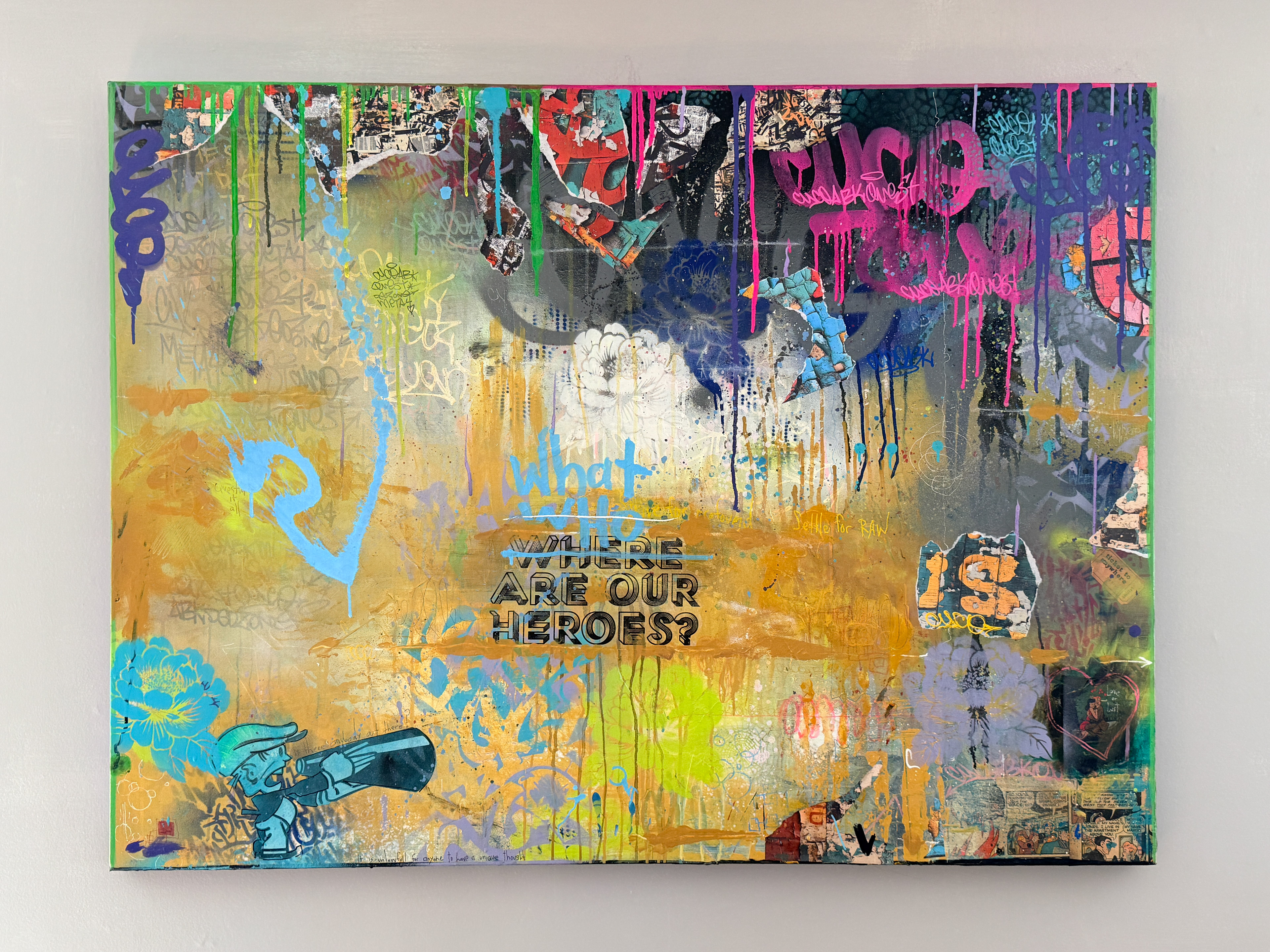 I have intentionally created a conflict between the hand-painted and the mechanical: Asking 'WHERE ARE OUR HEROES?' is a futile last attempt of redemption obscured and cancelled. This work is not a question, but a depiction of an absence—the tangible death of our essential connection to guidance in an era of static.