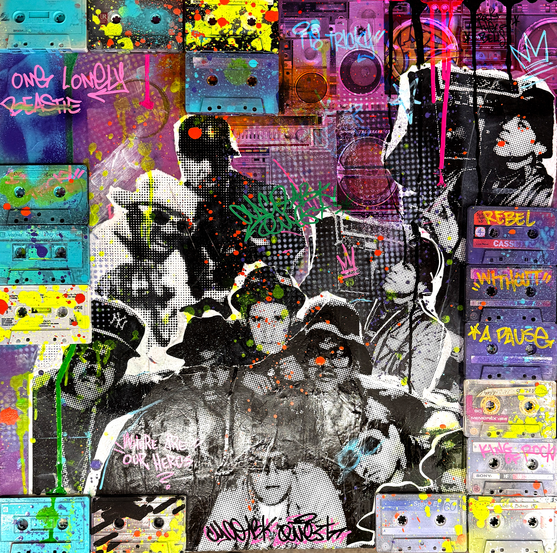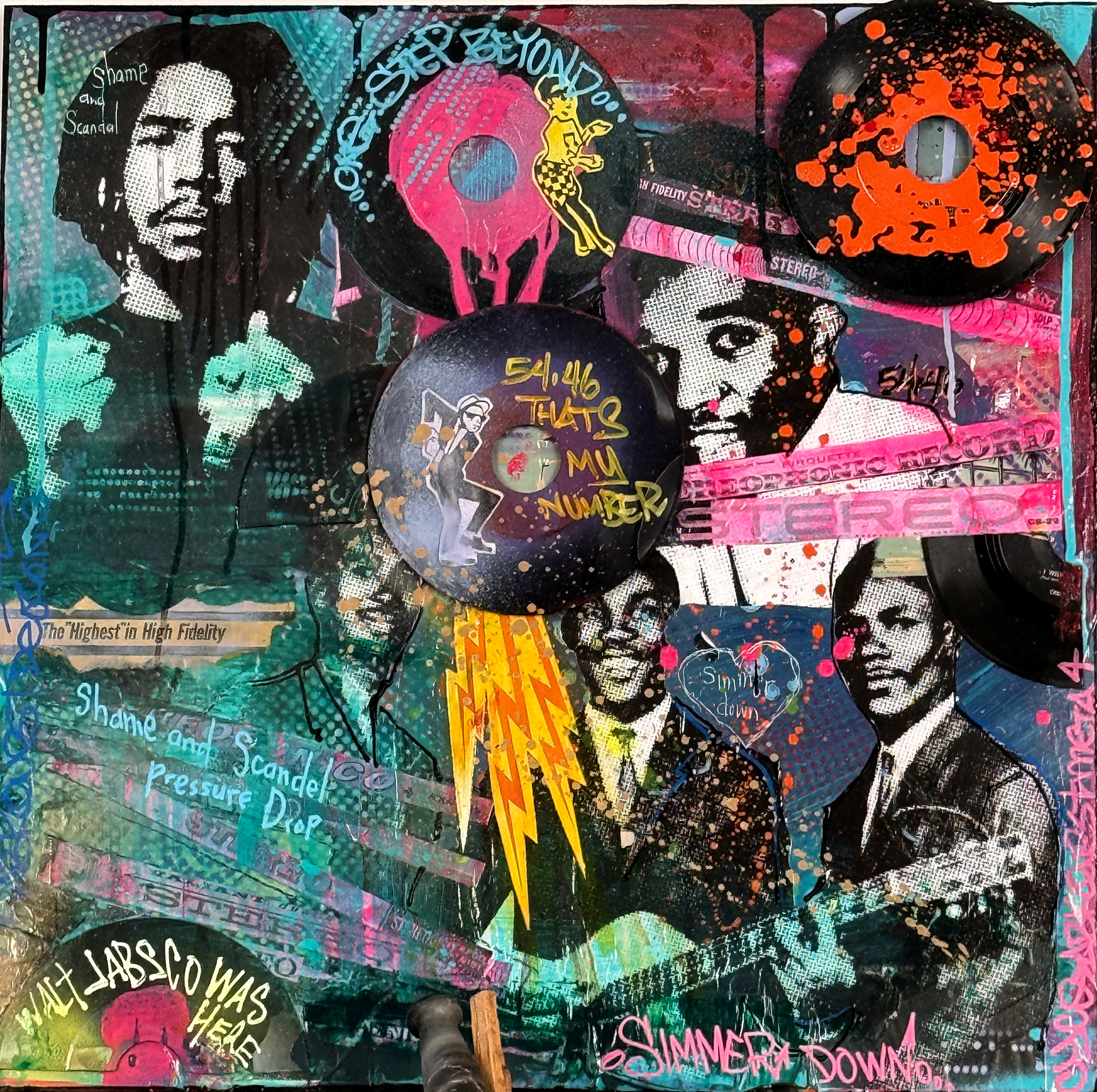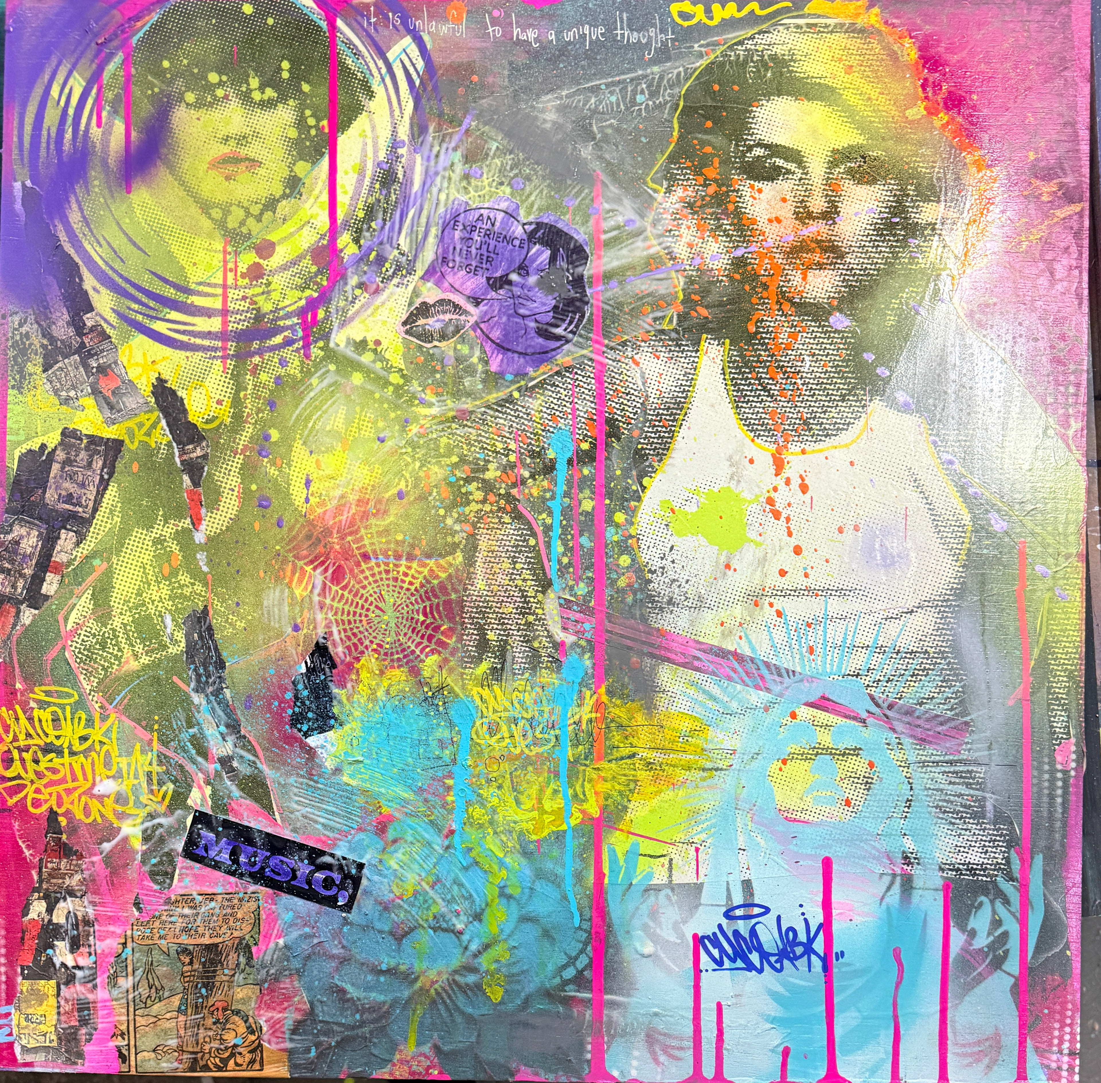 A series of three 24" x 24" mixed-media art on wood panel, this work is an exploration of the countercultural and iconoclastic spirit, using spray paint, acrylic, enamel, and collage to channel a defiant 'age of dissent.' The composition centers on fragmented, halftone-dot portraits of powerful musicians—overlaid with an intense, neon-hued graffiti-and-splatter background. Cassette tapes and 45 records added to represent my introduction to each genre anchoring the pieces in my lived experience within NYC hardcore and punk culture.